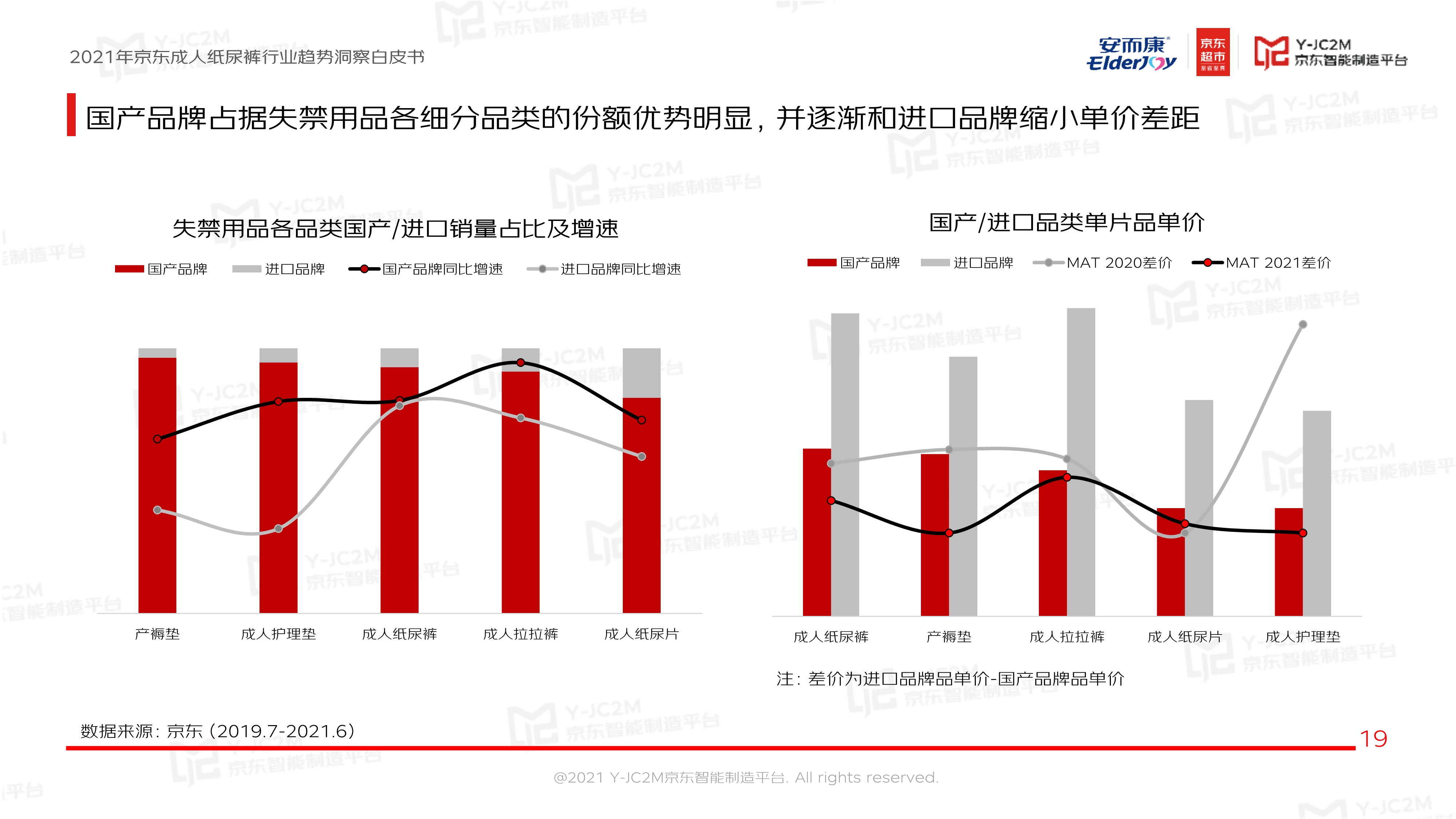 较婴儿纸尿裤发展,成人纸尿裤国产品牌入局更早、市占率高且主打品质性价比,技术已在近年与进口品牌相当,并在产品基础功能上(吸水性、材质、透气性)等做出改善,更好贴近用户需求。也正是基于这样的优势,国产品牌占据失禁用品各细分品类的份额优势明显,并逐渐和进口品牌缩小单价差距。